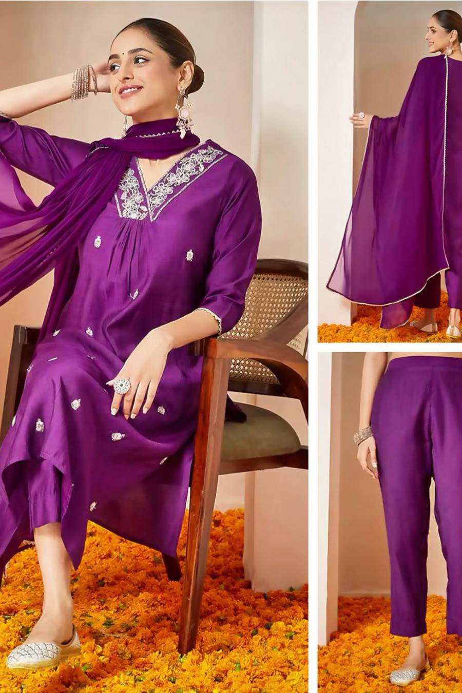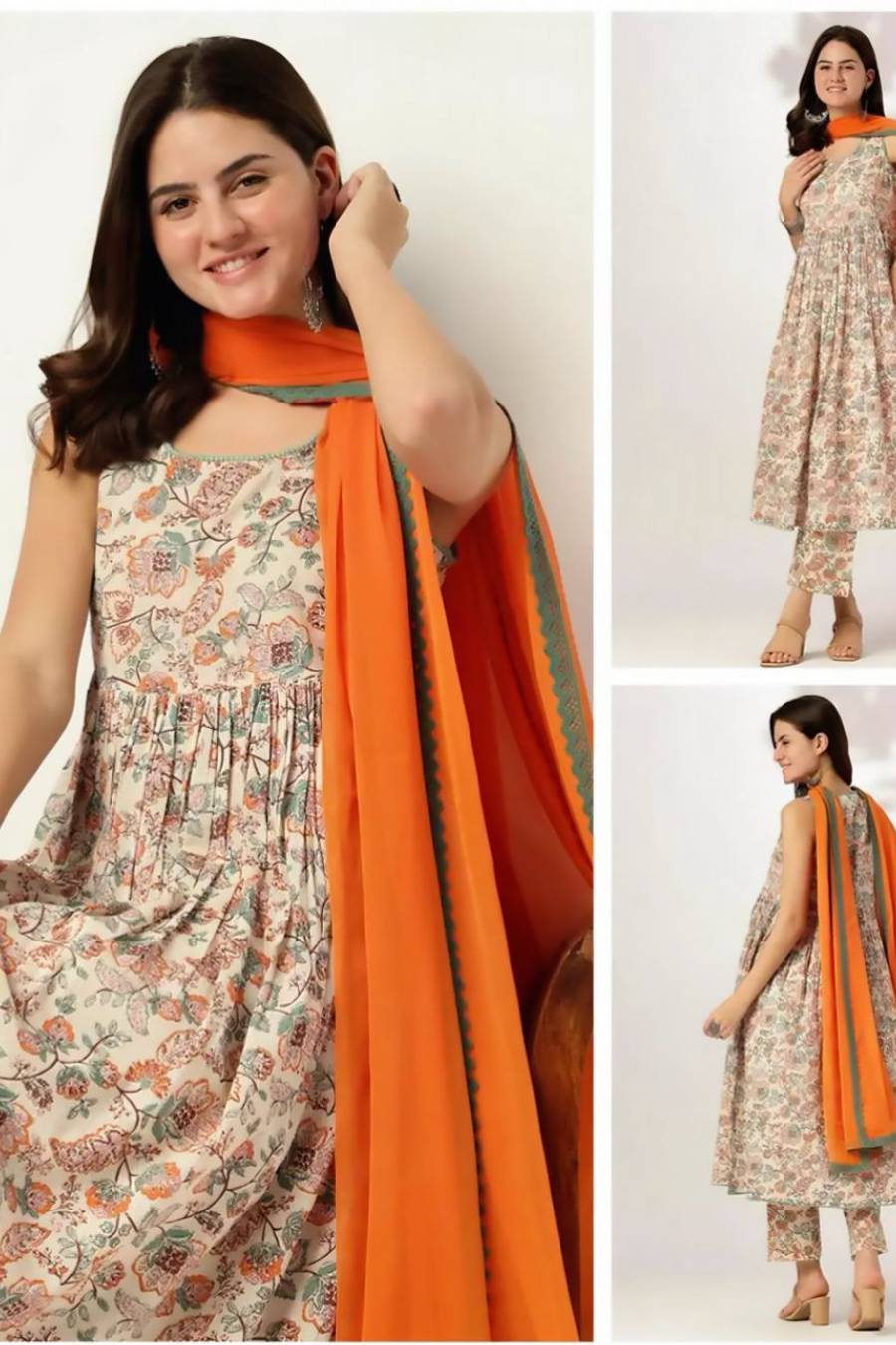 Cotton soft ivory base with multicolor floral print with orange dupatta